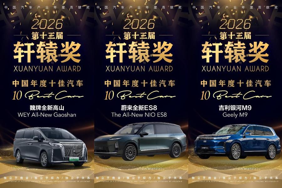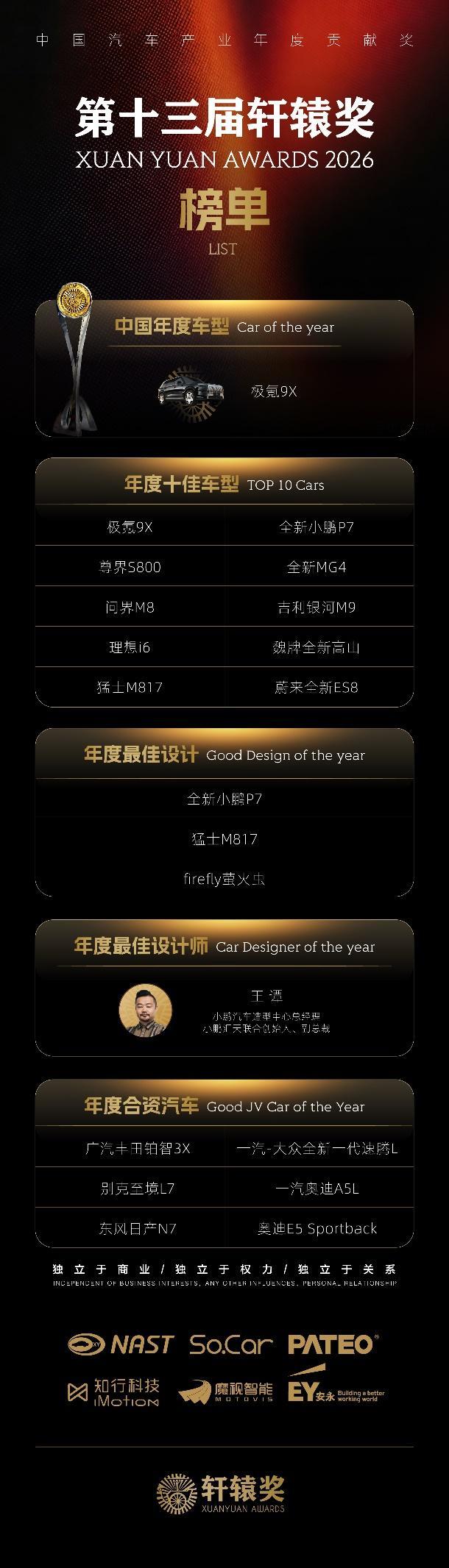 “中国年度十佳汽车” 榜单同步揭晓:问界M8、猛士M817、全新小鹏P7、理想i6、尊界S800、全新MG4、吉利银河M9、魏牌全新高山、蔚来全新ES8以及荣获中国年度汽车的极氪9X共计十款车型成功入选。这十款车型覆盖不同细分市场,凭借各自的核心优势展现了中国汽车产业的多元创新活力与综合实力。