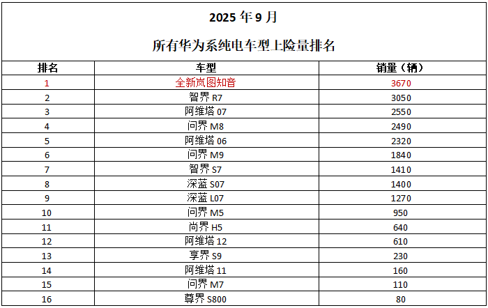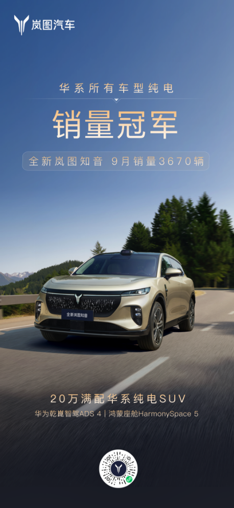 据中国银行保险监督管理委员会上险量数据统计,刚刚完成上市仅1个月的全新岚图知音展现出了强劲市场爆发力,2025年9月以3670辆的终端上险数据,成功问鼎所有华为系纯电车型销量冠军,实力超越智界R7(3050辆)、阿维塔07(2550辆)、问界M8(2490辆)等一众华为系热销车型,成为名副其实的华系纯电销冠。