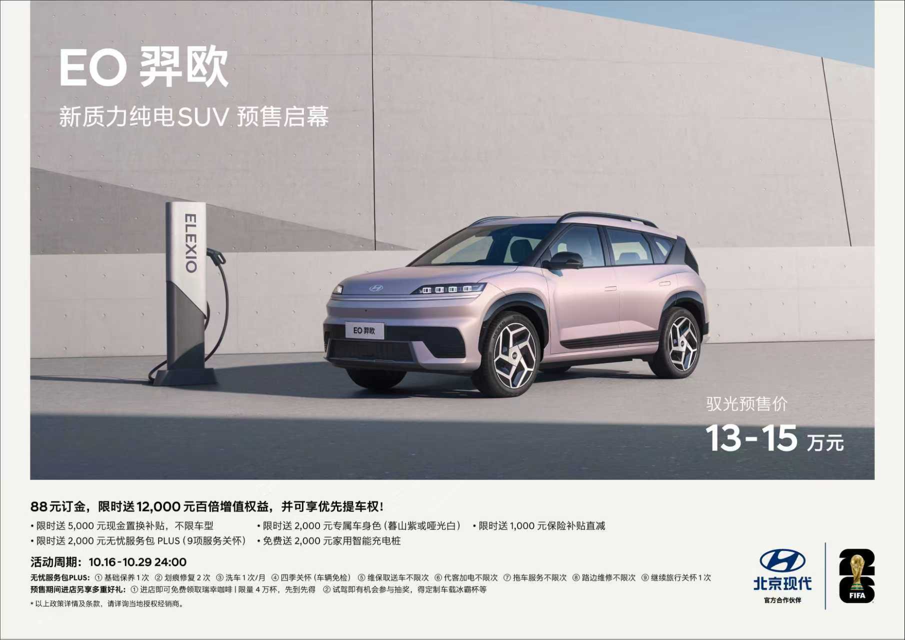 2025年10月16日,北京现代旗下首款基于E-GMP全球纯电平台打造的SUV——EO羿欧正式开启预售,预售价区间为13万-15万元。作为北京现代在电动化领域的里程碑式产品,EO羿欧凭借技术平台、设计语言与智能配置,成为合资品牌纯电SUV市场的有力竞争者。