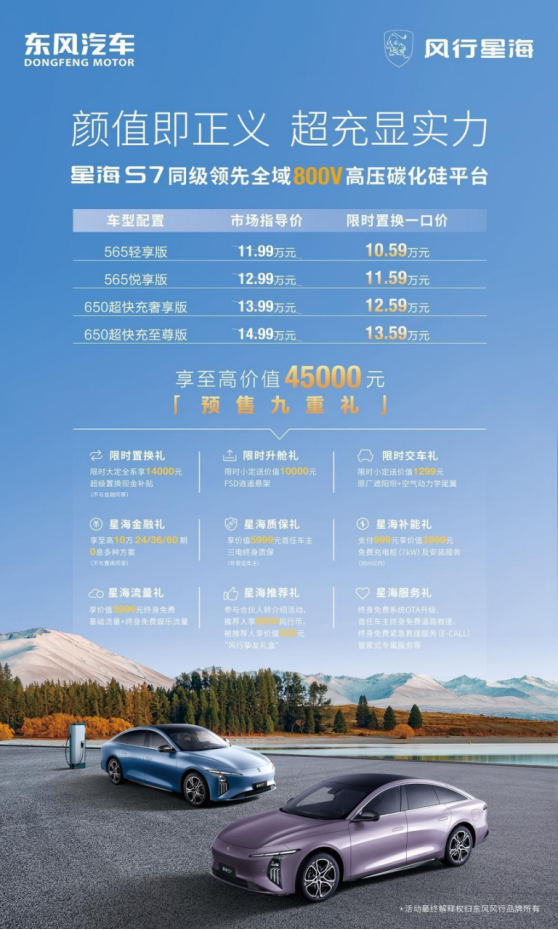 星海S7 800V超快充版正式开启预售,以“10万级价格、百万级享受”的极致性价比,为用户带来美好纯电出行新选择。目前,实车已陆续抵达全国门店,广大消费者可以亲临门店感受其卓越产品魅力。据悉,车型后续将于11月下旬举办线下上市发布会,届时,更多产品细节与专属权益也将同步揭晓,敬请期待。