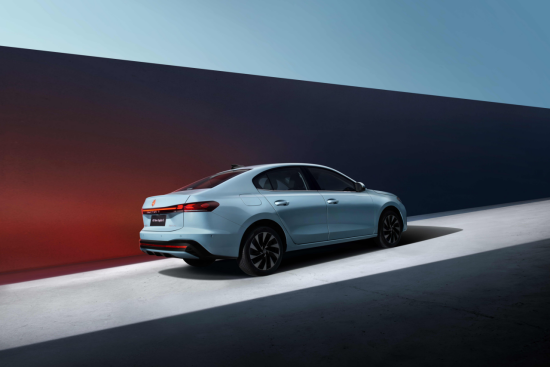 车身侧面,新车严格遵循“家用黄金比例”,简洁整体的特征线配合舒展的型面变化,营造出越级的高级感。溜背式造型搭配微微上翘的“小鸭尾”设计,在保证后排头部空间的同时,勾勒出动感流畅的尾部线条。