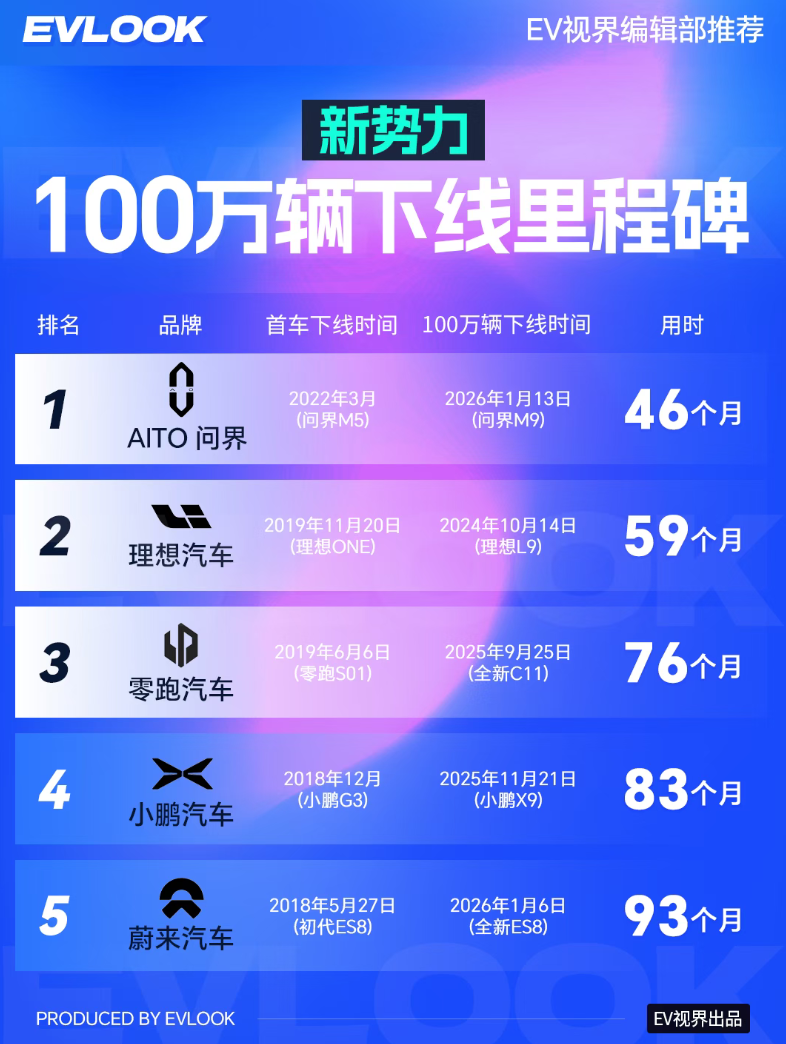 对比来看,理想汽车达成百万辆历时59个月,零跑汽车花了76个月,小鹏汽车用了83个月,蔚来汽车为93个月。