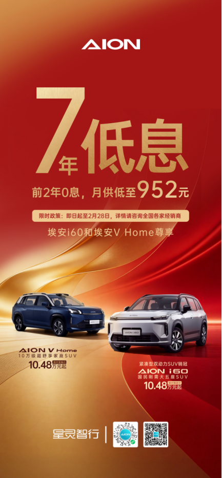 2026年1月27日,广汽埃安宣布,为积极响应国家“两新”政策导向,进一步降低家庭购车门槛,旗下两款“国民好车”代表——i60与V Home正式加推“7年低息”限时购车政策。在2026年即日起至2月28日期间,消费者购买上述车型可申请长达7年的贷款方案,其中前2年享受0利息,月供最低至952元,日供仅32元起。