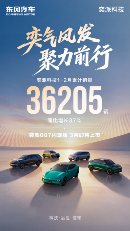 奕派科技逆势增长!3月1日公布的最新数据显示,奕派科技2月销量达14464台,保持同比增长;1-2 月累计销量36205台,同比增长37%,成功打赢新春第一仗。在行业整体下滑的形势下,奕派科技延续开门红势头,彰显强劲发展动能。乘势而上,奕派科技开启新一轮营销攻势,奕派007闪现版将在3月上市,其余多款新品也将陆续登场。