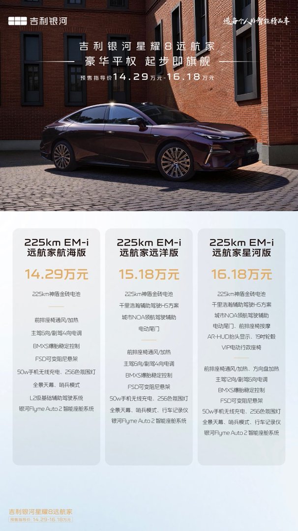 3月21日,吉利银河旗下中高级插混轿车旗舰——银河星耀8远航家正式开启全国预售,新车共推出航海版、远洋版、星河版三款配置车型,预售指导价区间为14.28-16.18万元,凭借超长续航、硬核配置与诚意定价,一举成为家用插混轿车市场的热门选择,同步上线的多重预售权益,更是进一步拉满购车性价比。