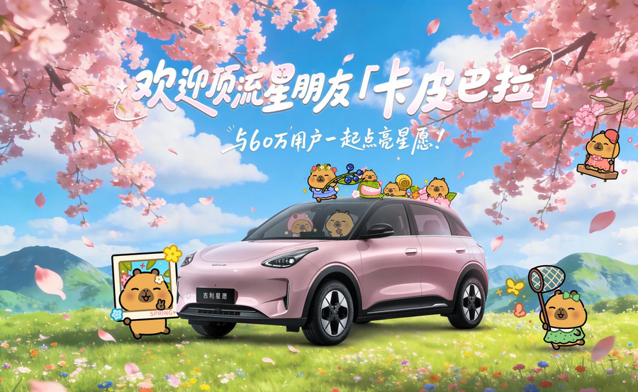 同时,为了贴近用户对松弛感、治愈感生活方式的追求,吉利星愿正式官宣与顶流“星”朋友卡皮巴拉小黄豚跨界联动,为60万老车主带来丰厚福利,车主可通过银河APP抽取卡皮巴拉盲盒和相关福利。