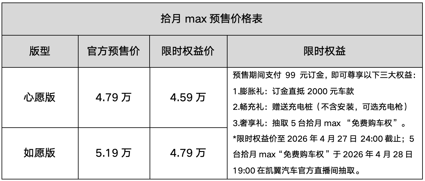 *限时权益价至2026年4月27日 24:00截止;5台拾月max“免费购车权”于2026年4月28日19:00在凯翼汽车官方直播间抽取。