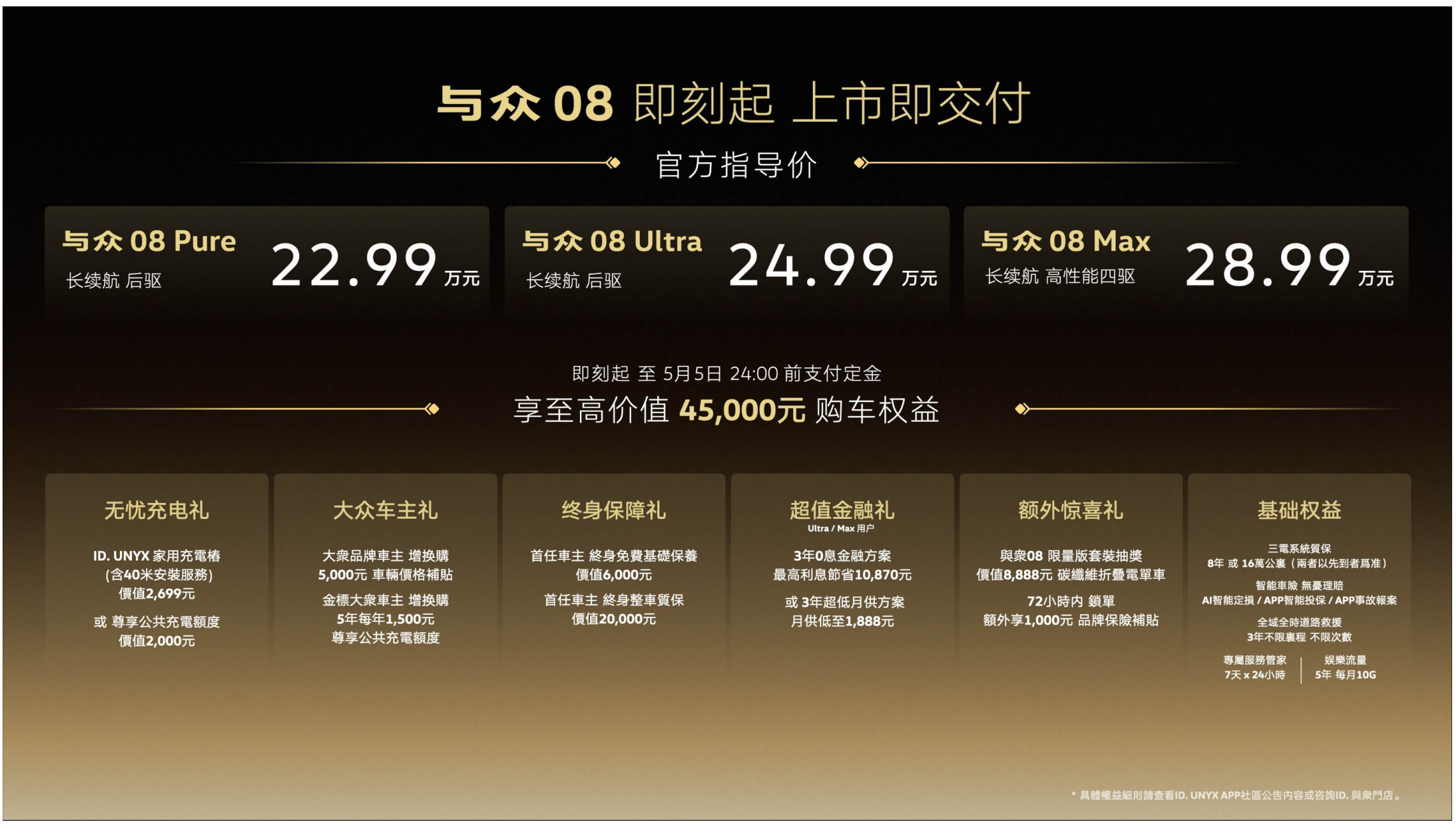 【2026年4月16日,深圳】历经24个月的潜心开发,金标大众旗下首款全时互联全尺寸纯电SUV——与众08正式上市,新车推出了Pure、Ultra、Max共3个版本,官方指导价为22.99万元-28.99万元。新车推出了丰富的限时权益,即刻起至5月5日24:00前支付定金,即可享至高价值45,000元购车权益。