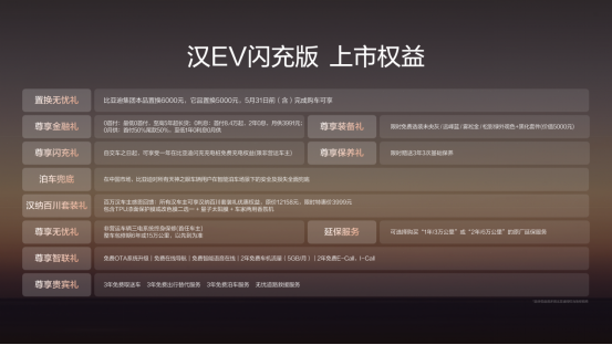 同时,比亚迪还为用户准备了置换无忧礼、1年免费闪充权益、0首付/0利息/0月供任选其一的金融礼、3年3次基础保养、包含3年免费取送车的尊享贵宾礼等共11项权益。针对追求个性的用户,官方推出价值超1.2万元的“汉纳百川”进阶生活套装,限时特惠价仅需3999元。